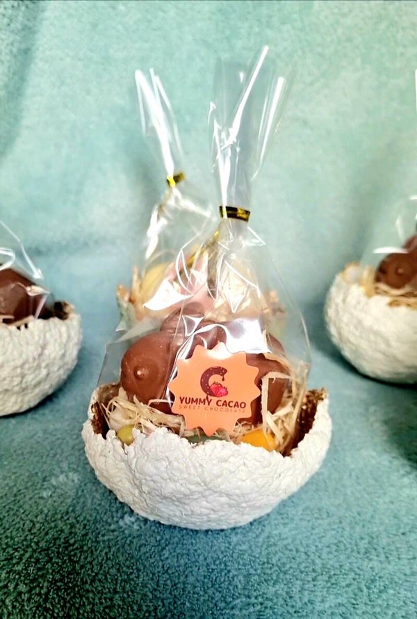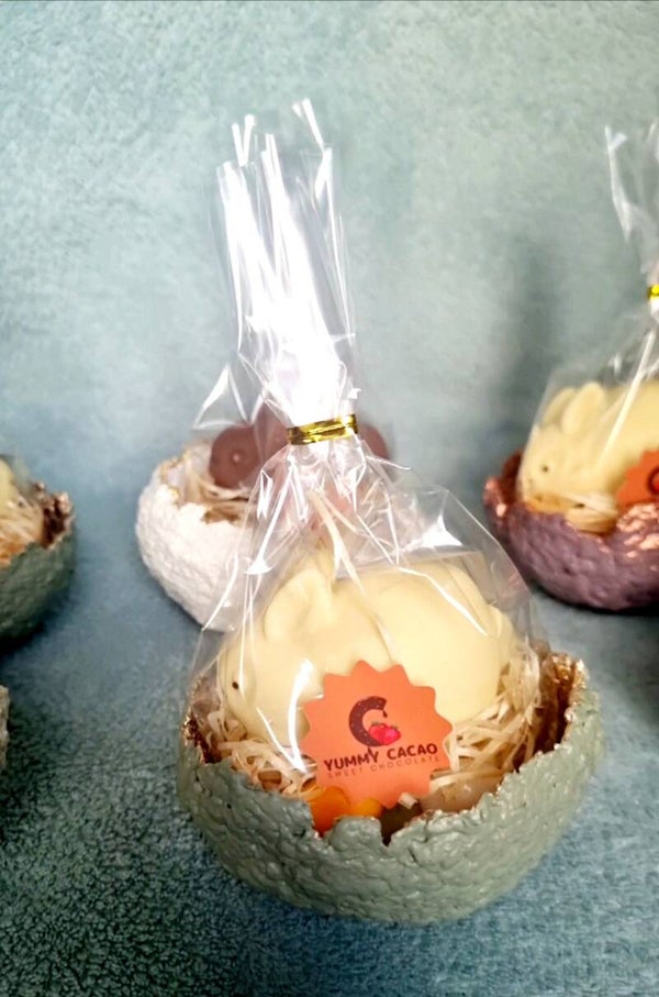 Chaque lapin est présenté individuellement dans un élégant balotin, accompagné de petits œufs en sucre colorés pour une touche festive. Le tout est délicatement niché dans une coquille précieuse, fabriquée en papier recyclé et sublimée par de délicates dorures.