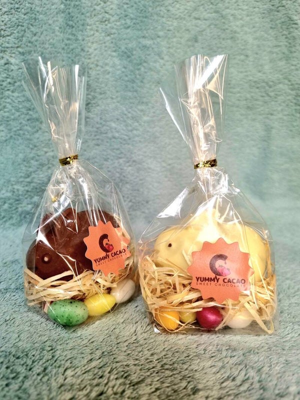 Chaque lapin est présenté individuellement dans un élégant palotet, accompagné de petits œufs en sucre colorés pour une touche festive.